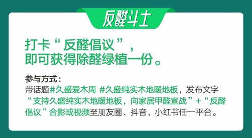 向甲醛宣战,与健康同行,第11季久盛爱木周,从脚下开始,为爱木发声,为健康护航,久盛纯实木地暖地板为每一个家庭创造更加健康、环保的家居生活环境。